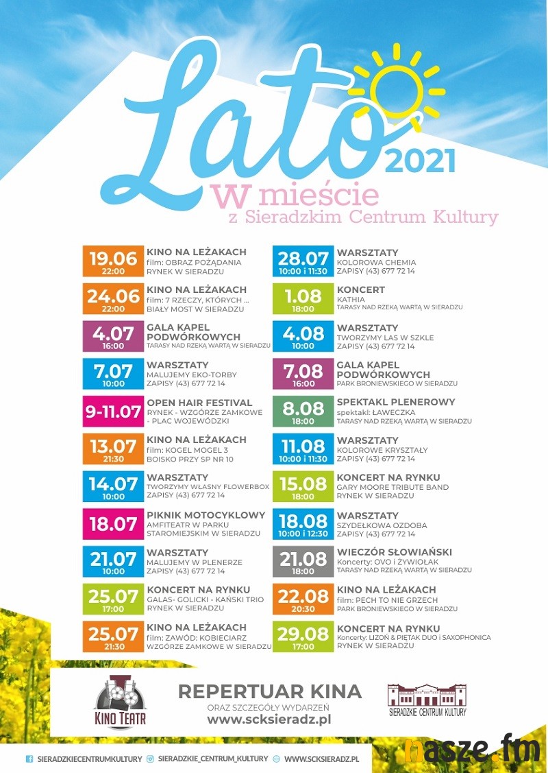 Sieradzkie Centrum Kultury zaprasza na "Lato w mieście". Nie zabraknie koncertów, seansów filmowych czy wakacyjnych warsztatów dla dzieci. Więcej szczegółów na plakacie.