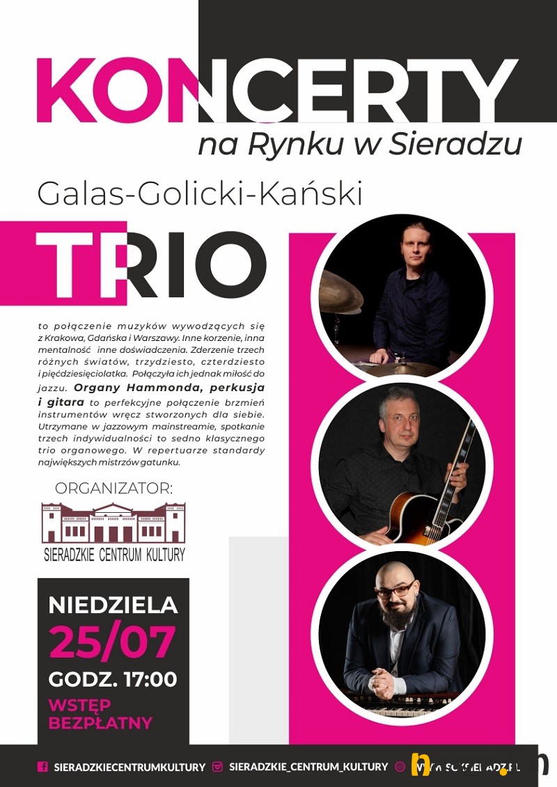 - Galas-Golicki-Kański trio to połączenie muzyków wywodzących się z Krakowa, Gdańska i Warszawy.Inne korzenie, inna mentalność inne doświadczenia. Zderzenie trzech różnych światów , trzydziesto, czterdziesto i pięćdziesięciolatka. Połączyła ich jednak miłość do jazzu. Organy Hammonda, perkusja i gitara to perfekcyjne połączenie brzmień instrumentów wręcz stworzonych dla siebie. Utrzymane w jazzowym mainstreamie spotkanie trzech indywidualności to sedno klasycznego trio organowego. W repertuarze standardy największych mistrzów gatunku- informują organizatorzy