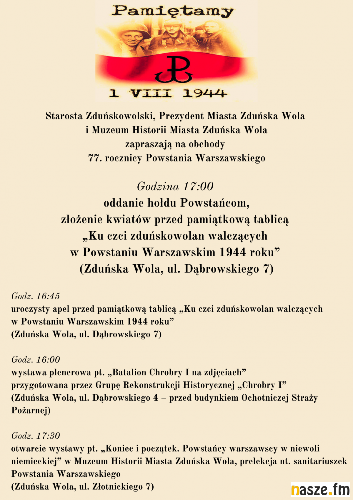 W niedzielę, 1 sierpnia, przypada 77. rocznica wybuchu Powstania Warszawskiego. Obchodów nie zabraknie w Zduńskiej Woli.