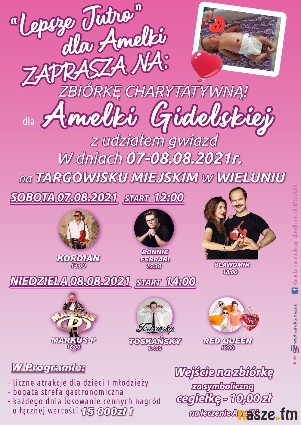 Sławomir, Ronnie Ferrari oraz inni znani artyści wystąpią w Wieluniu podczas charytatywnej zbiórki z udziałem gwiazd, która odbędzie się w dniach 7 - 8 sierpnia 2021 r. na placu targowiska miejskiego w Wieluniu. Dochód z wydarzenia zostanie przeznaczony na leczenie Amelii Gidelskiej.