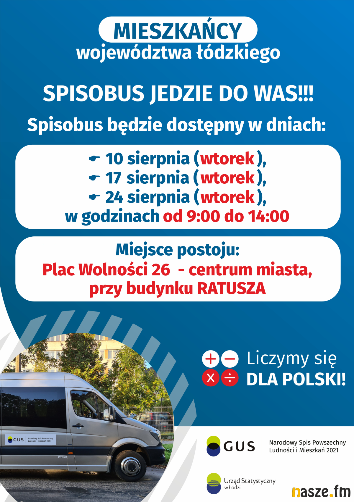 W dniach 10, 17 oraz 24 sierpnia w godz. 9:00 – 14:00 będzie można dokonać spisu w tzw. Spisobusie, który będzie ustawiony przy Ratuszu na Placu Wolności 26 w Zduńskiej Woli.