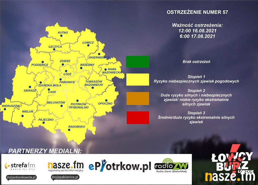 Synoptycy z Instytutu Meteorologii i Gospodarki Wodnej a także Łowcy Burz Łódzkie wydali dla województwa łódzkiego ostrzeżenia pierwszego stopnia przed niebezpiecznymi zjawiskami atmosferycznymi. Prognozują wyładowania, silny wiatr i intensywne opady deszczu. Lokalnie może też spaść grad.