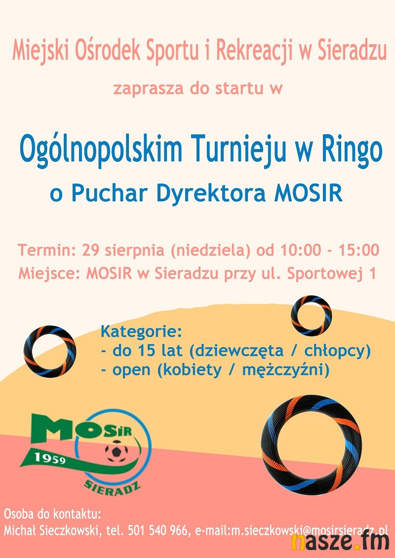 Miejski Ośrodek Sportu i Rekreacji w Sieradzu zaprasza na Ogólnopolski Turniej Ringo „O Puchar Dyrektora MOSiR”. Impreza odbędzie się 29 sierpnia.