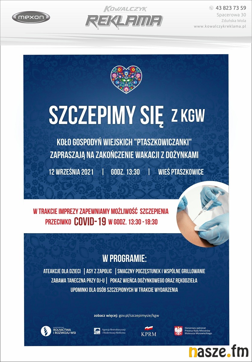 Koło Gospodyń Wiejskich Ptaszkowiczanki zaprasza w najbliższą niedzielę, 12 września, na piknik z okazji zakończenia wakacji, dożynki oraz akcję szczepimy się z KGW. Wszystko to przy Klubie Seniora w Ptaszkowicach (gm. Zapolice).