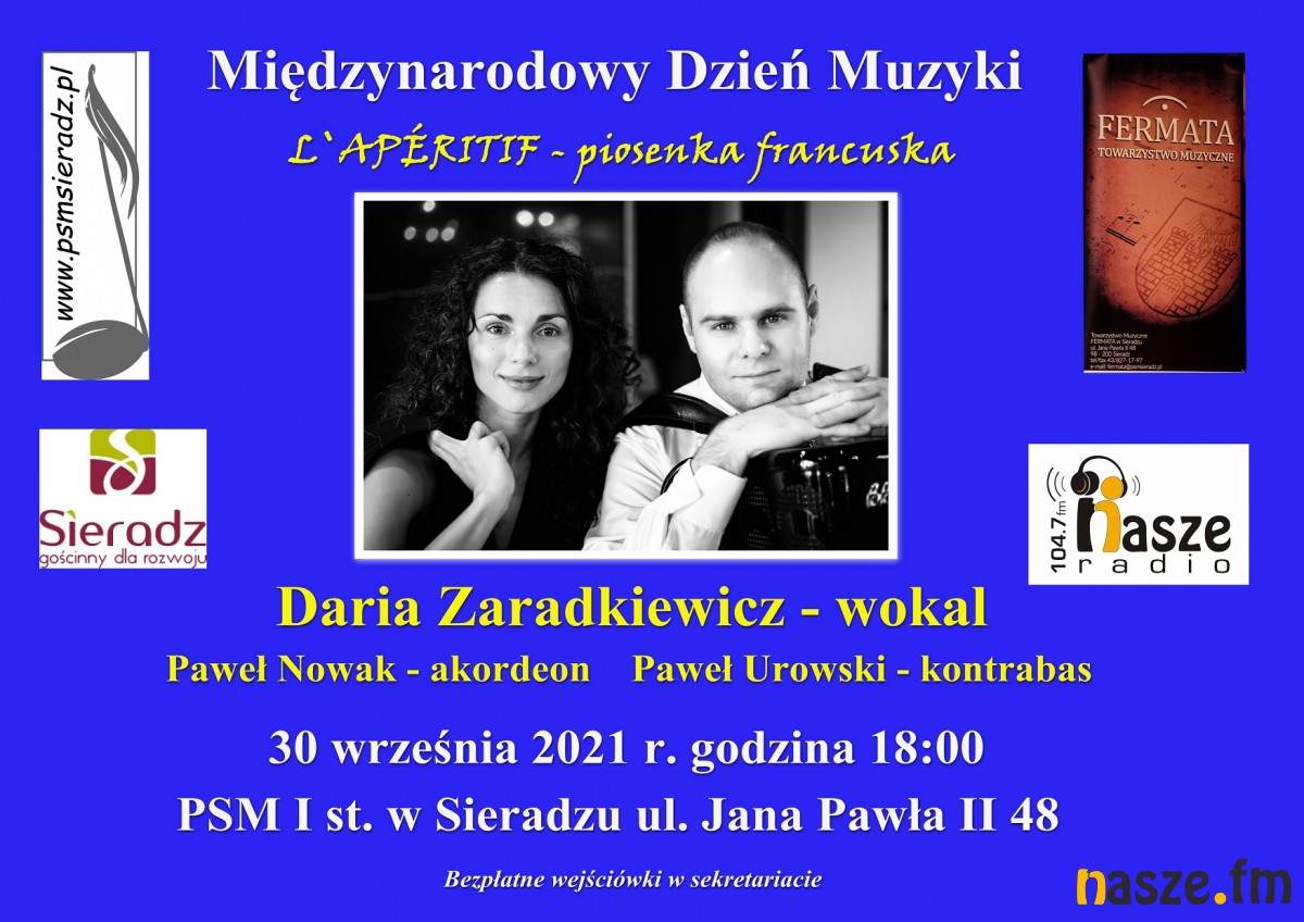 Międzynarodowe święto muzyki i muzyków przypada 1 października. Dzień wcześniej w sali koncertowej Państwowej Szkoły Muzycznej I st. w Sieradzu, z tej okazji, odbędzie się koncert Darii Zaradkiewicz. Na scenie z wokalistką wystąpią Paweł A. Nowak (akordeon) i Paweł Urowski (kontrabas). W tym roku będzie to muzyczna podróż Francji.