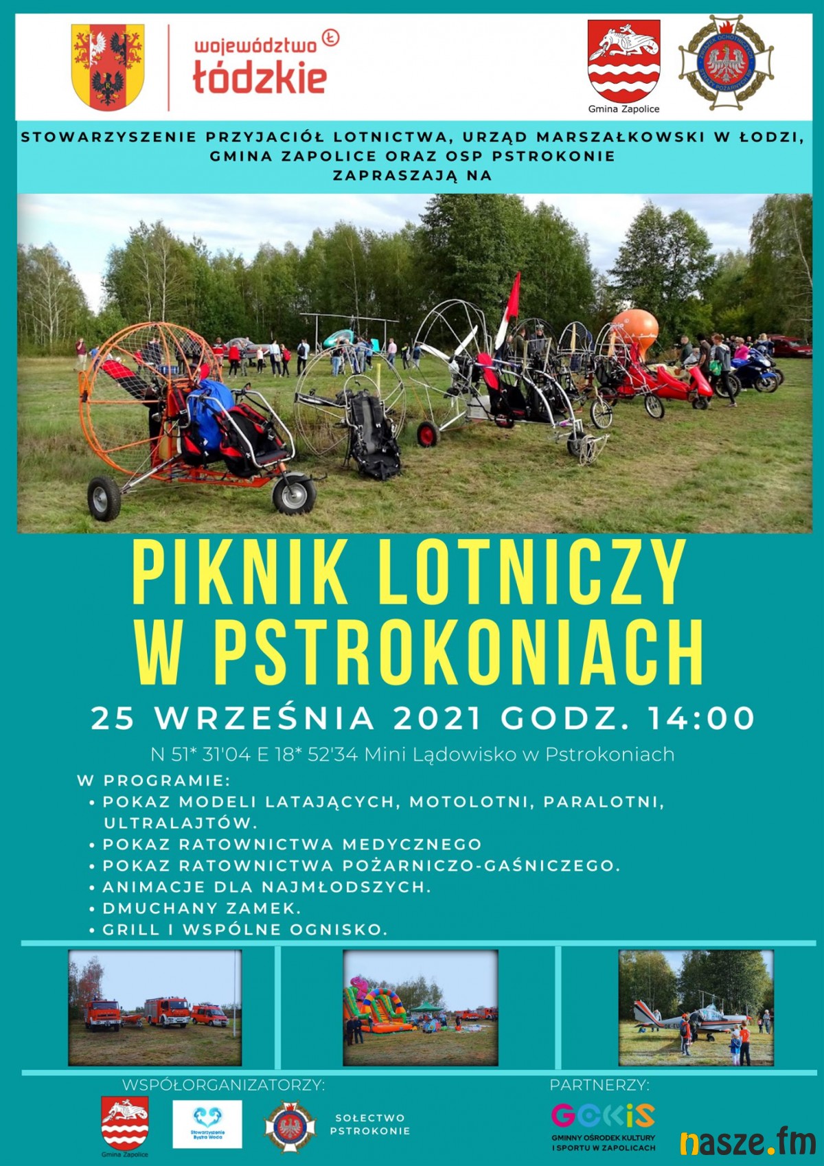 W programie wydarzenia znajdują się m.in. pokaz modeli latających, motolotni, paralotni i ultralajtów Będzie także pokaz ratownictwa medycznego i pożarniczo-gaśniczego, nie zabraknie animacji dla najmłodszych oraz wspólnego ogniska. Piknik organizowany jest przez Stowarzyszenie Przyjaciół Lotnictwa, Urząd Marszałkowski w Łodzi, Gmina Zapolice i OSP Pstrokonie.
