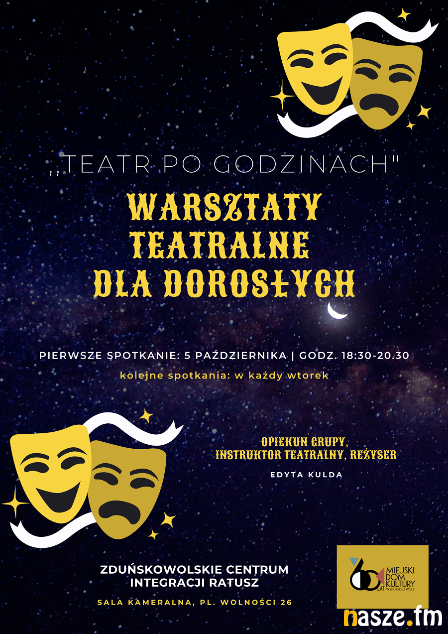 Świat teatru, gdzie możecie stać się kimś innym i poczuć emocje, których nie doświadczycie na co dzień? "Teatr Po Godzinach", warsztaty teatralne dla dorosłych – to nowa propozycja zajęć Miejskiego Domu Kultury Centrum Integracji Ratusz.