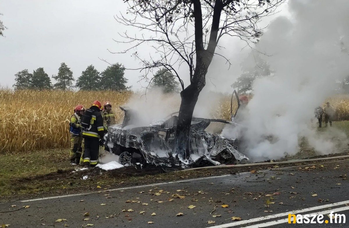 20- letni kierowca nie dostosował prędkości do warunków atmosferycznych. Podczas manewru wyprzedzania, uderzył w drzewo. W wyniku kolizji auto się zapaliło, kierowca na szczęście nie doznał większych obrażeń. Na trasie nie ma utrudnień w ruchu.