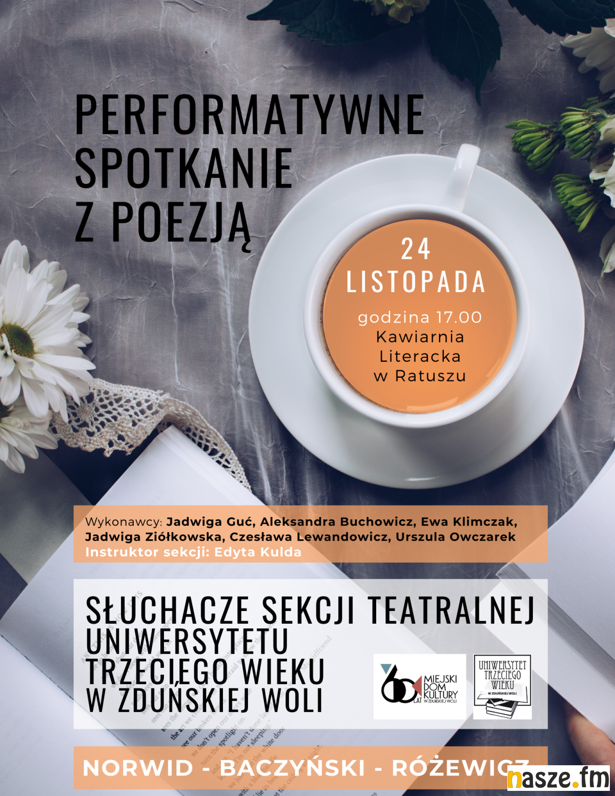 Performatywne spotkanie z poezją – takie wydarzenie dzisiaj odbędzie się w Centrum Integracji Ratusz w Zduńskiej Woli a to w związku z uznaniem roku 2021 rokiem poezji. Wiersze Norwida, Baczyńskiego i Różewicza zaprezentują słuchaczki sekcji teatralnej Uniwersytetu Trzeciego Wieku.
