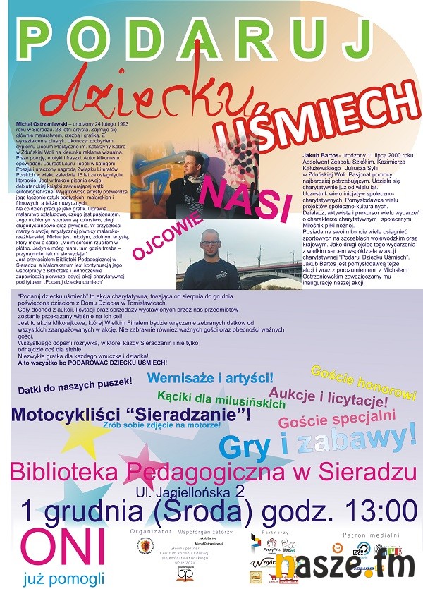 - Jest to akcja Mikołajkowa, której Wielkim Finałem będzie wręczenie zebranych datków od wszystkich zaangażowanych w akcję. Nie zabraknie również ważnych gości oraz obecności ważnych gości. Wszystkiego dopełni rozrywka, w której każdy Sieradzanin i nie tylko odnajdzie coś dla siebie. Niezwykła gratka dla każdego wnuczka i dziadka! W najbliższą środę 1 grudnia zapraszamy już od godziny 13tej do Biblioteki Pedagogicznej na ostatnią imprezę charytatywną, rodziców i dzieci. Gry, zabawy manualne i lekcje malarskie dla wszystkich chętnych- zapraszają Michał Ostrzeniewski i Jakub Bartos.
