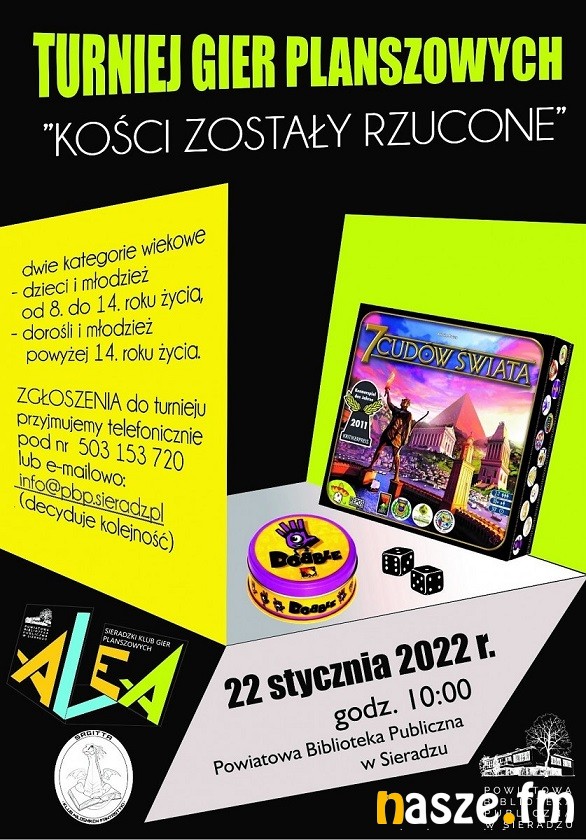 Sieradzki Klub Gier Planszowych ALEA oraz Klub Miłośników Fantastyki Sagitta działające przy Powiatowej Bibliotece Publicznej w Sieradzu zapraszają dzieci od 8. roku życia, młodzież i dorosłych na I Turniej Gier Planszowych, który odbędzie się sobotę 22 stycznia o godzinie 10.00. w czytelni dla dzieci i młodzieży.