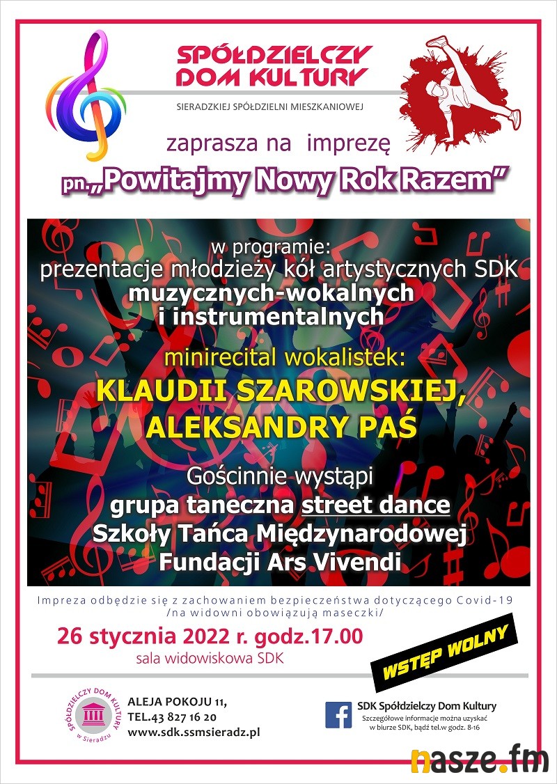 Spółdzielczy Dom Kultury w Sieradzu zaprasza dziś na imprezę pn. "Powitajmy Nowy Rok Razem". W programie prezentacje młodzieży kół artystycznych SDK- wokalnych, muzycznych i instrumentalnych. Odbędzie się też minirecital wokalistek: Klaudii Szarowskiej i Aleksandry Paś.