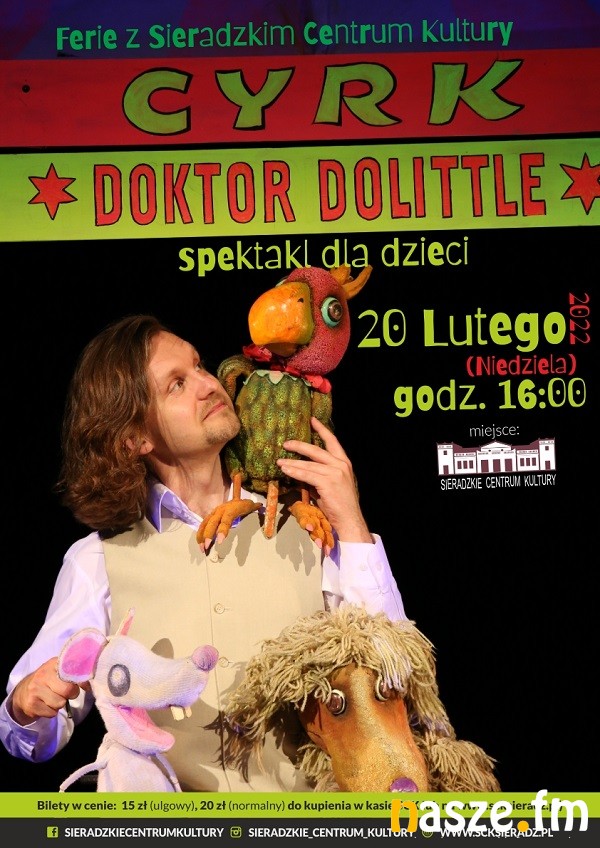 Sieradzkie Centrum Kultury zaprasza w niedzielę 20 lutego na spektakl dla dzieci „Cyrk Doktora Dolittle", na podstawie powieści Hugha Johna Loftinga. Jak informują organizatorzy bajka jest skierowana dla dzieci w wieku od 3 do 100 lat.