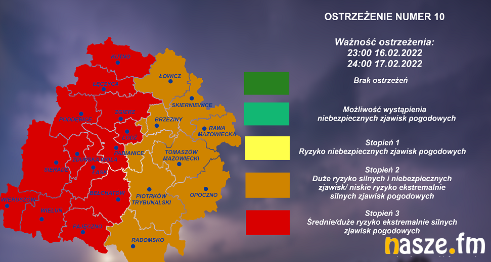 Stopień 3 (czerwony), powiaty: kutnowski, łęczycki, poddębicki, zgierski, m. Łódź, sieradzki, zduńskowolski, łaski, pabianicki, wieruszowski, wieluński, pajęczański, bełchatowski
