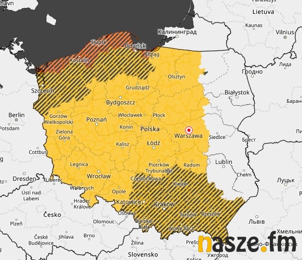 Wydali też dla Łódzkiego ostrzeżenie pierwszego stopnia przed silnym wiatrem, które będzie aktualne dziś do 18:00: Prognozuje się wystąpienie silnego wiatru o średniej prędkości od 30 km/h do 40 km/h, w porywach do 90 km/h, z zachodu. Lokalnie możliwe burze.