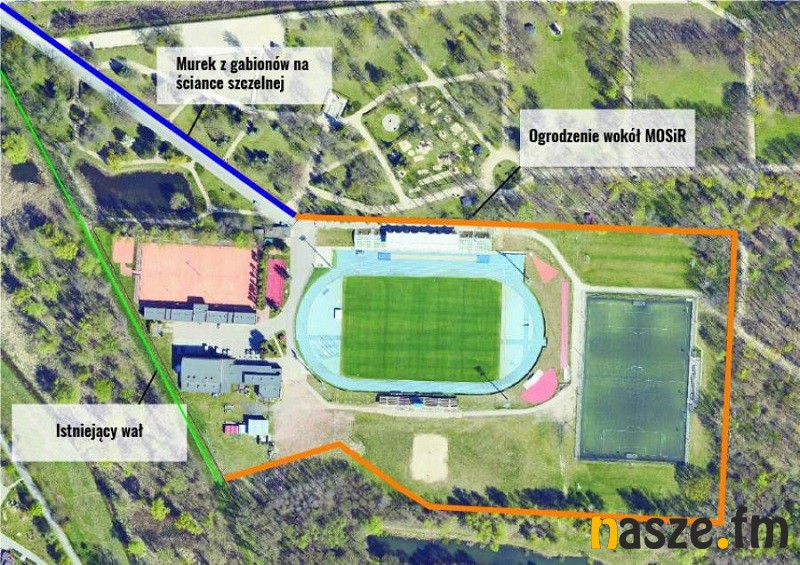 Wspomniana ścianka będzie elementem nowego ogrodzenia terenu ośrodka. Będzie ono składało się z muru żelbetowego i właśnie systemu paneli ogrodzeniowych montowanych na słupach. Łączna jego długość wyniesie 830 metrów. Na terenie parku im. Adama Mickiewicza, od strony ul. Sienkiewicza, wzdłuż drogi dojazdowej do MOSiR powstanie zabezpieczenie w postaci murku z gabionów uszczelnionego ścianką szczelną z grodzic stalowych. Długość murku wyniesie blisko 230 m.