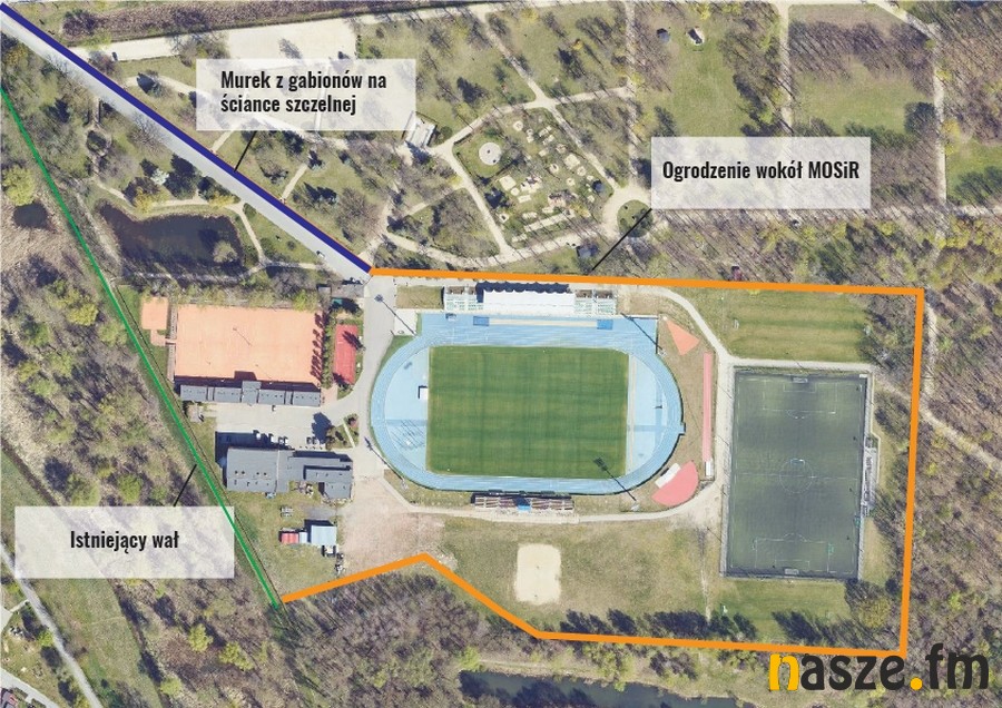 23 maja 2010 r. woda, która wdarła się na sieradzki MOSiR zalała niemal cały obiekt, łącznie z boiskiem, bieżnią, kortami tenisowymi. Do historii przeszło zdjęcia kajaka pływającego pośrodku głównej płyty stadionu. Dzisiaj koszty podtopienia byłyby zdecydowanie większe, bo ostatnie lata to wielomilionowe inwestycje w infrastrukturę MOSiR. Doświadczenia sprawiły, że miasto zamierza kolejne pieniądze zainwestować w zabezpieczenia przeciwpowodziowe. Temu właśnie ma służyć inwestycja, której wykonawcę poszukuje magistrat. - Gdy dziesięć lat temu ten teren zalało, powierzchnia wody sięgała 70 cm. Chcemy temu zapobiec na przyszłość. Funkcję bariery będzie pełniła ścianka stalowa, która uszczelni ogrodzenie wokół obiektów MOSiR - mówi Paweł Osiewała, prezydent Sieradza. Wspomniana ścianka będzie elementem nowego ogrodzenia terenu ośrodka. Będzie ono składało się z muru żelbetowego i właśnie systemu paneli ogrodzeniowych montowanych na słupach. Łączna jego długość wyniesie 830 metrów. Na terenie parku im. Adama Mickiewicza, od strony ul. Sienkiewicza, wzdłuż drogi dojazdowej do MOSiR powstanie zabezpieczenie w postaci murku z gabionów uszczelnionego ścianką szczelną z grodzic stalowych. Długość murku wyniesie blisko 230 m.