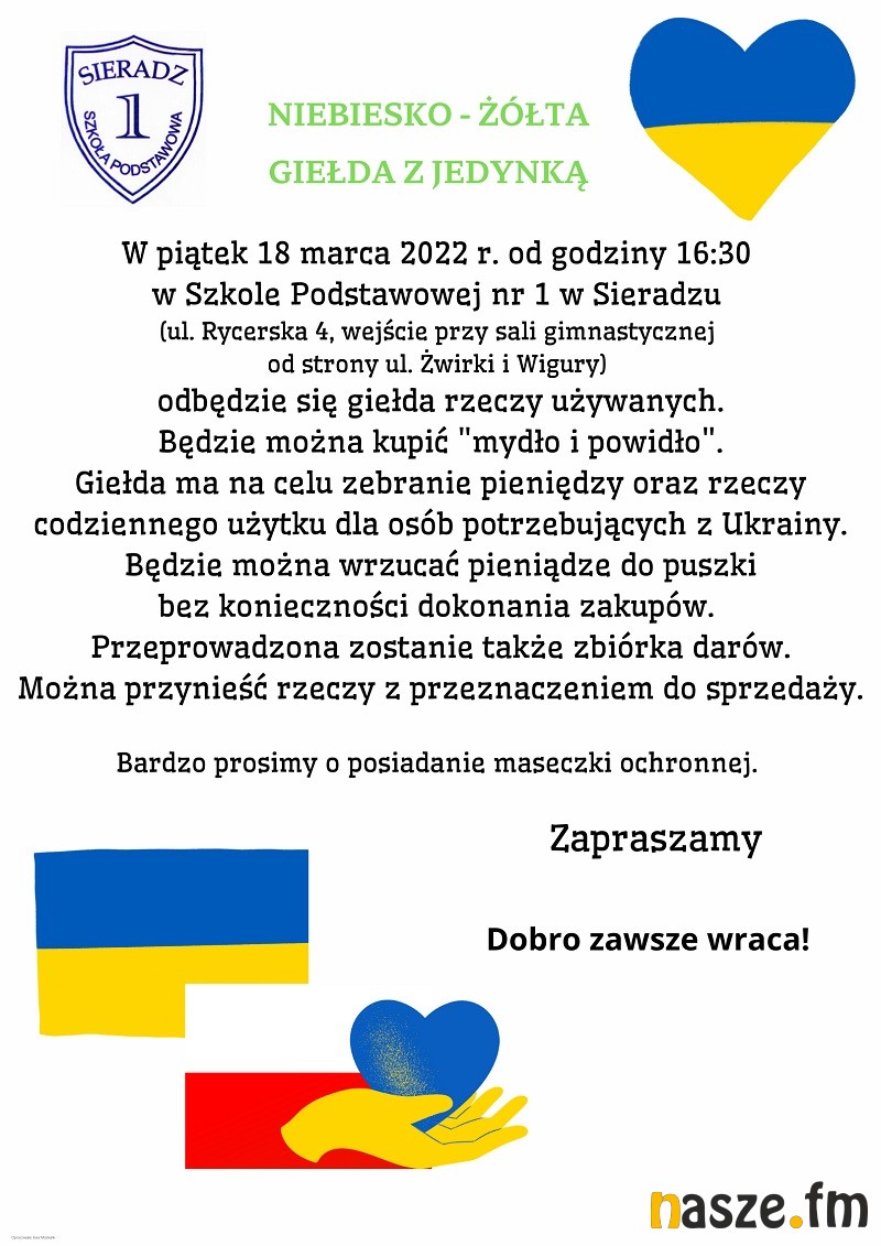 W związku z trwającą na Ukrainie wojną Szkoła Podstawowa nr 1 w Sieradzu organizuje giełdę przedmiotów różnych. Organizatorzy zachęcają do przynoszenia: książek, gier komputerowych, gier planszowych, zabawek czy własnoręcznie wykonanych ozdób. Pieniądze zebrane podczas giełdy zostaną przekazane na pomoc osobom z Ukrainy. Giełda odbędzie się jutro o 16:30.