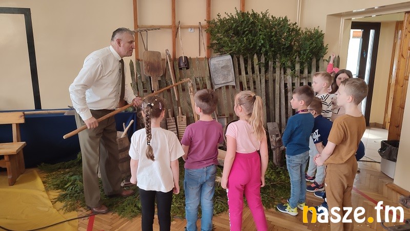 Dzieci obserwowały też wrób tradycyjnego ciasta drożdżowego oraz różne sposoby robienia swetrów na drutach. Uczniowie obejrzeli również tradycyjne wyposażenie gospodarstwa wiejskiego.