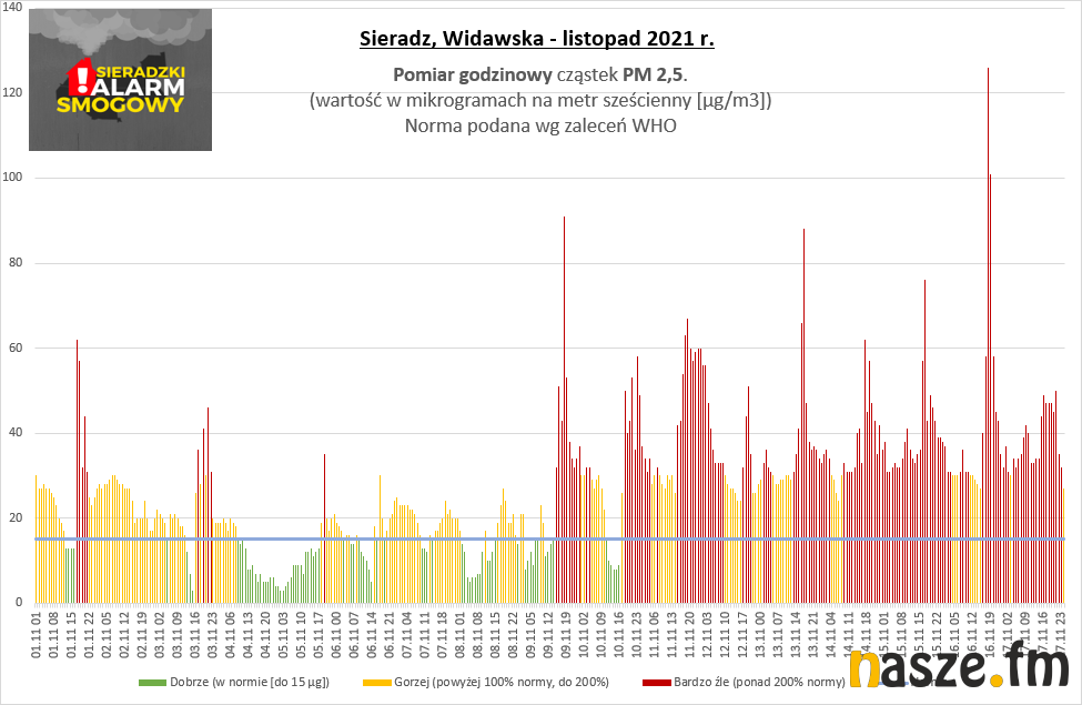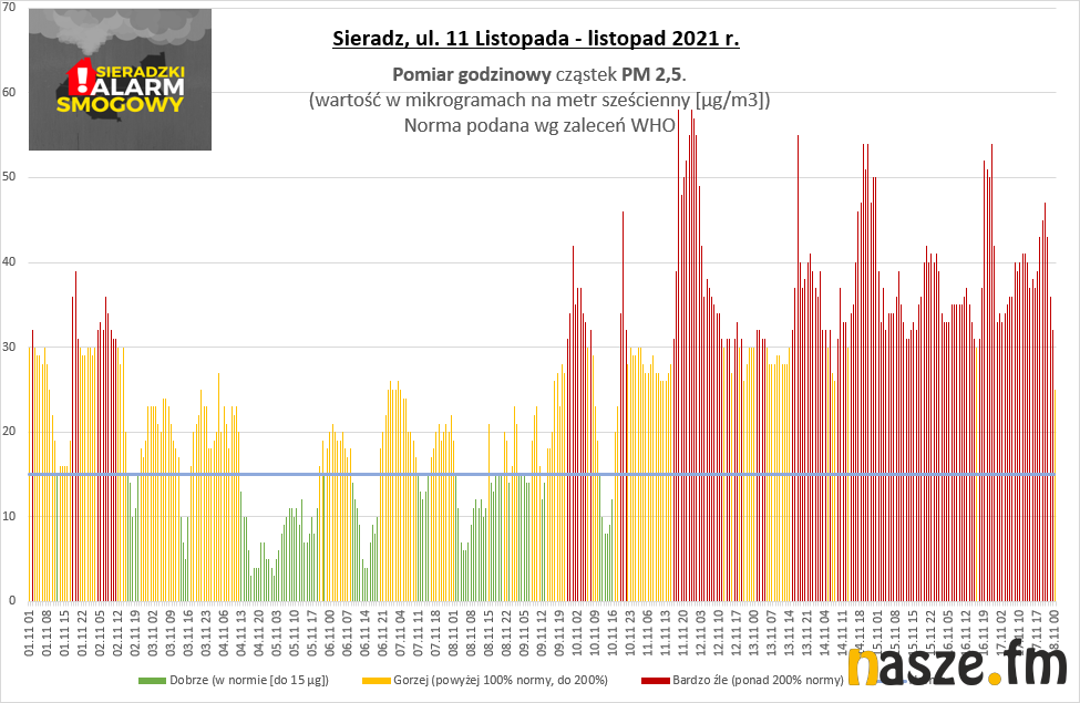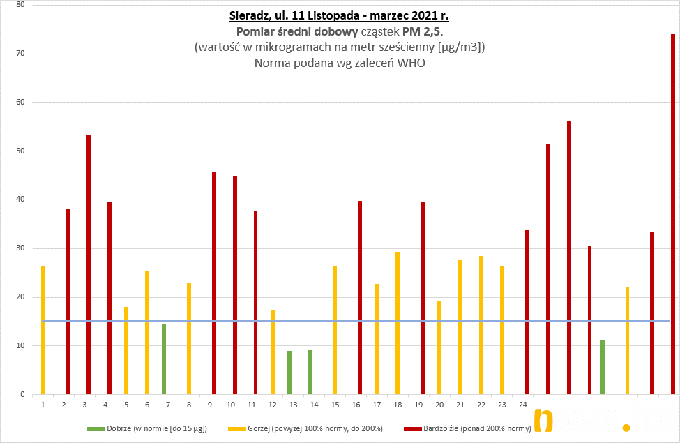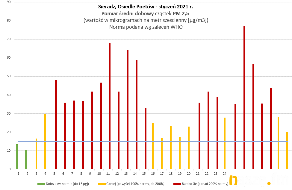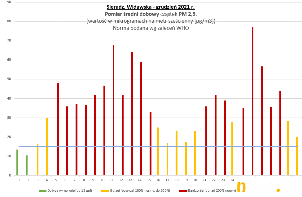 Pyły PM 2.5 - wg WHO dobowe stężenie pyłów PM 2.5 nie powinno przekraczać poziomu 15 µg/m3, a w ciągu roku powinny być maksymalnie 3 dni z przekroczeniem tego poziomu a tymczasem w Sieradzu mamy takich dni w roku około 200!!!