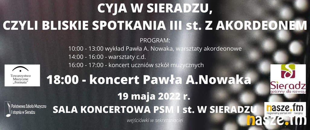 - Oprócz koncertu uczniów w programie "Cyi" znajdzie się wykład Pawła A. Nowaka, warsztaty dla zespołów akordeonowych, a na zakończenie nasz gość zagra krótki recital – zapowiada Sławomir Cieślak, prezes Towarzystwa Muzycznego Fermata i wicedyrektor PSM I st. w Sieradzu