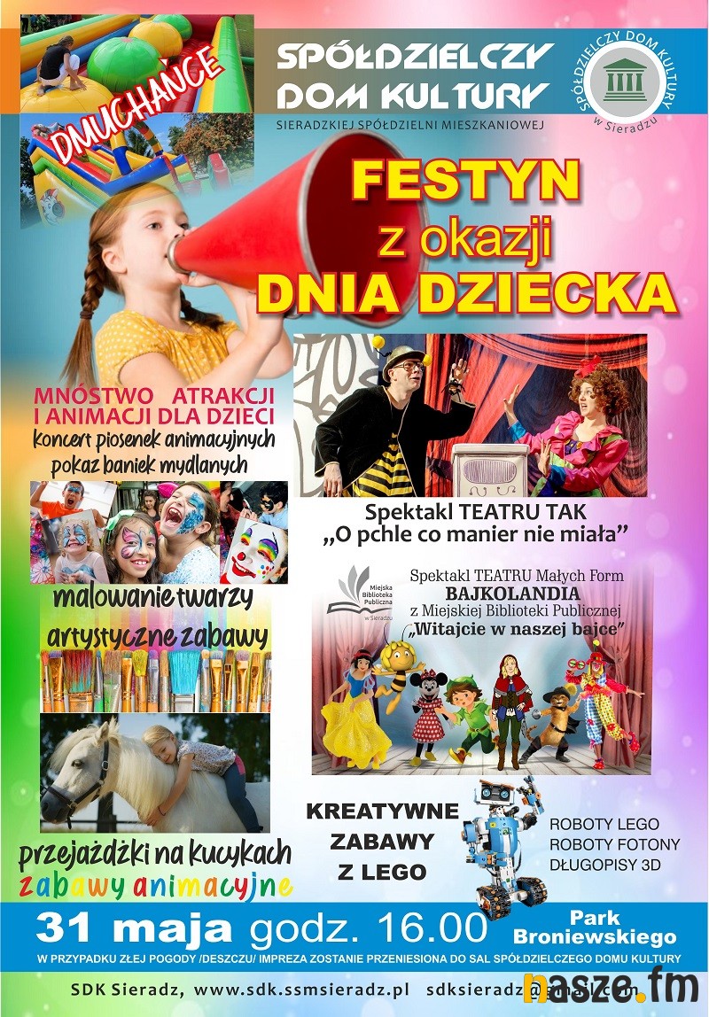 Dzień Dziecka będzie jutro, ale świętować możecie już dziś. Spółdzielczy Dom Kultury w Sieradzu zaprasza do Parku Broniewskiego na Festyn. Na dzieci czeka wiele atrakcji, jedną z nich będzie spektakl „Teatru TAK” pt.”O pchle co manier nie miała” oraz Koncert Piosenek Animacyjnych w wyk. Emilii Rutkowskiej, laureatki ogólnopolskich festiwali muzycznych i aktora Teatru TAK Dariusza Bekasa.