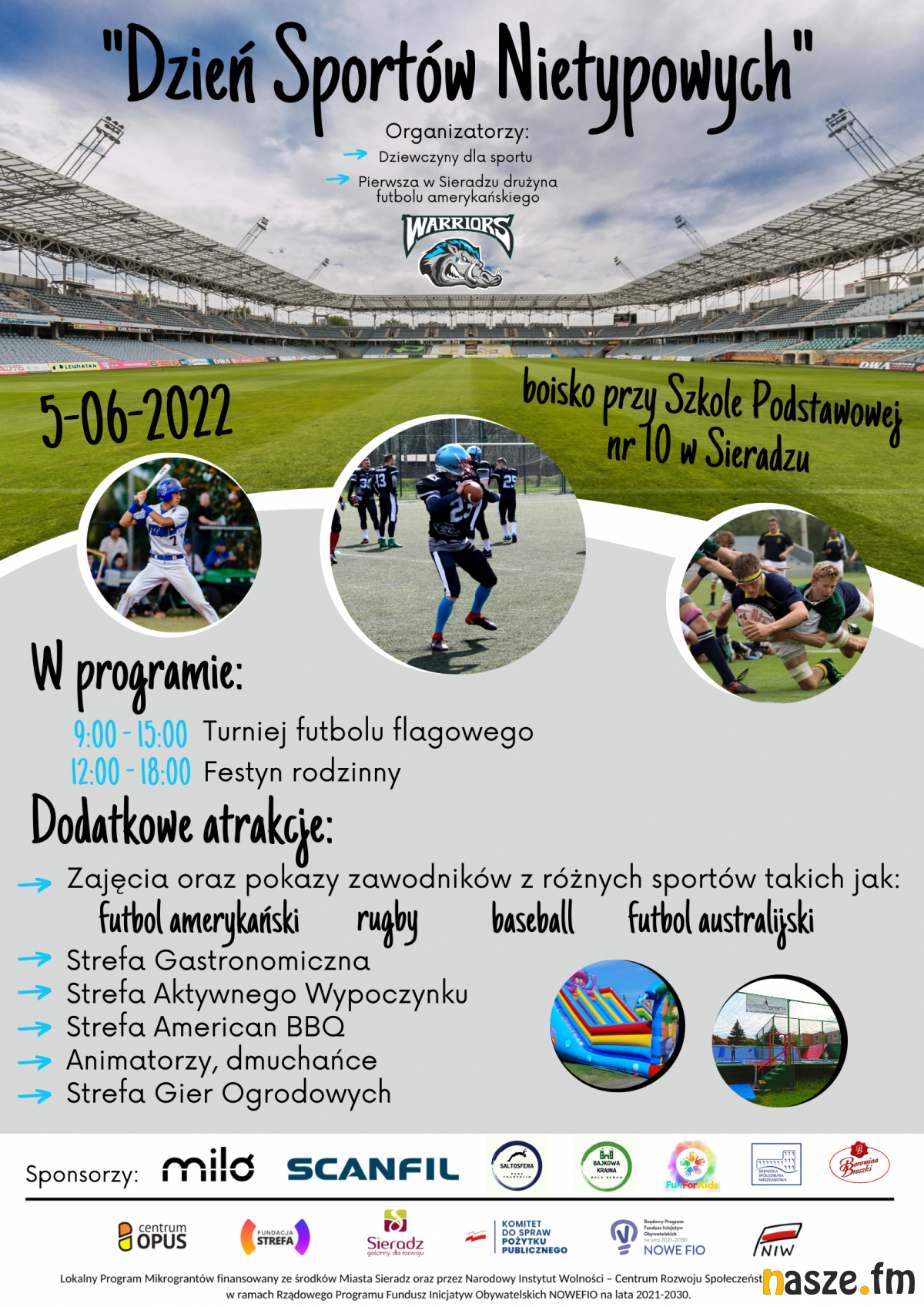 Klub Warriors Sieradz zaprasza na „Dzień Sportów Nietypowych”. W programie zajęcia z futbolu amerykańskiego, rugby, baseballu i futbolu australijskiego. Impreza odbędzie się 5 czerwca na boisku przy Szkole Podstawowej nr 10 w Sieradzu.