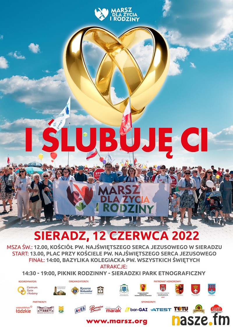 - W tym roku idziemy pod hasłem "I ślubuję Ci...". A więc zapraszamy w szczególny sposób tych, którzy ślubowali, jak i tych, którzy będą ślubować. Każdy jest zaproszony do kolorowego i uśmiechniętego przemarszu od kościoła NSJ do Bazyliki kolegiackiej, aby dać wyraz przywiązaniu do tradycyjnej rodziny, trwałego małżeństwa i ukochania życia na każdym jego etapie. Po Marszu, poprzedzonym Mszą św. w kościele NSJ o godz. 12:00 zapraszamy na pełen atrakcji Piknik rodzinny na terenie Sieradzkiego Parku Etnograficznego przy ul. Grodzkiej 1. W godzinach 14:30 - 19:00 będzie tam mnóstwo dobrej zabawy, pysznego jedzenia, zmagań sportowych oraz dobrej rozrywki na scenie. Chodź z nami- zapraszają organizatorzy
