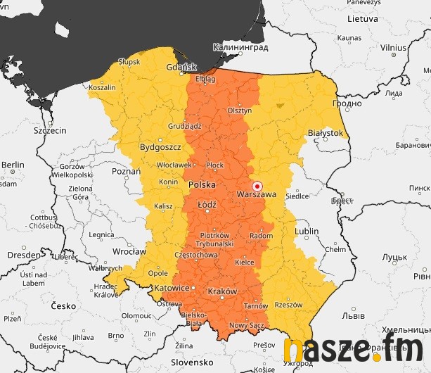 Na mapie poniżej kolorem żółtym oznaczono obszar, dla którego instytut wydał ostrzeżenie pierwszego stopnia, pomarańczowym - drugiego. W części Łódzkiego, gdzie będzie obowiązywać ostrzeżenie drugiego stopnia prognozowane są burze, którym miejscami będą towarzyszyć bardzo silne opady deszczu do 30 mm, lokalnie do 50 mm, oraz porywy wiatru do 75 km/h. Miejscami grad.