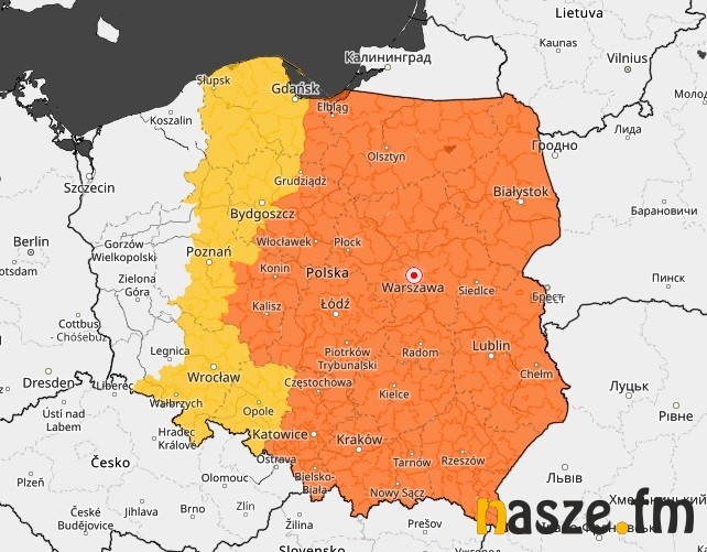 Na mapie poniżej kolorem żółtym oznaczono tereny, dla których synoptycy wydali ostrzeżenie pierwszego stopnia, pomarańczowym - drugiego. Ostrzeżenia będą aktualne dziś do godz. 20:00