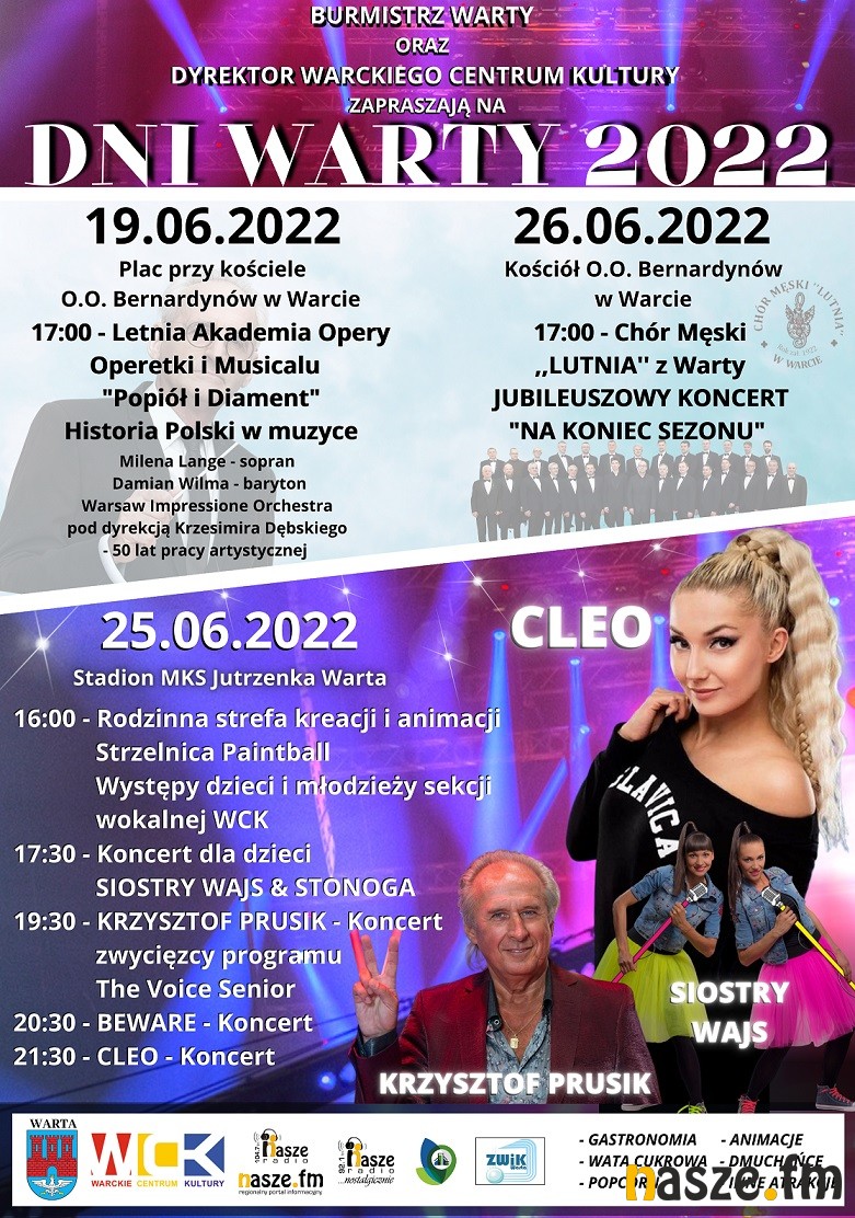 Kolejne miasto rozpoczyna swoje święto. W Warcie, obchody dni tego miasta, rozpoczną się w niedzielę 19 czerwca koncertem w Klasztorze oo. Bernardynów w ramach cyklu "Letnia Akademia Opery Operetki i Musicalu". Zaplanowano też koncerty Cleo, Krzysztofa Prusika i Chóru Męskiego "Lutnia".