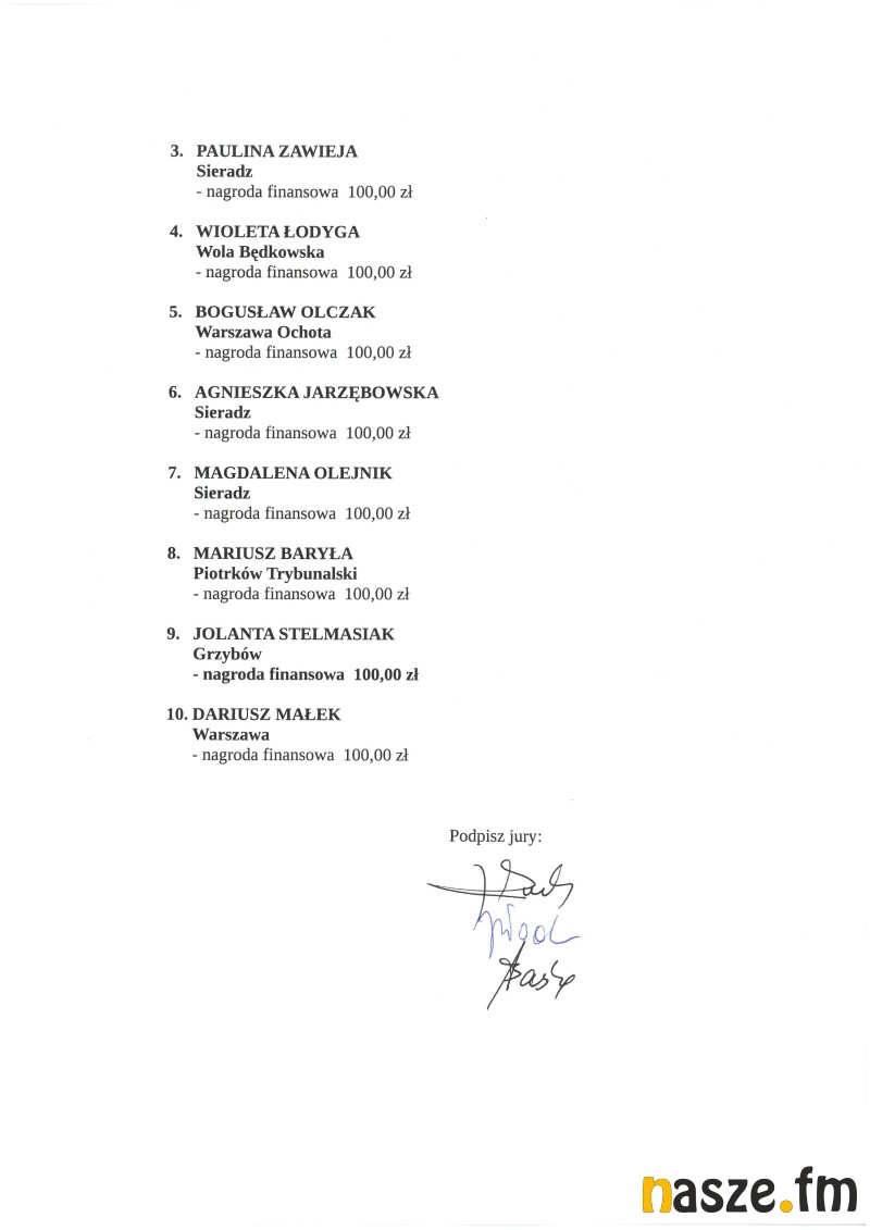 W Turnieju Jednego Wiersza o Puchar Starosty Sieradzkiego i Nagrodę Prezydenta Sieradza zmierzyło się 13 poetów z całej Polski. Poziom zaprezentowanych wierszy był wyjątkowo wyrównany i zasiadający w jury Joanna Słodyczka, Anna Baśnik i Musa Czachorowski mieli bardzo trudne zadanie i zdecydowali się na rozstrzygnięcie, jakiego dotąd na sieradzkim festiwalu nie było. Otóż, przyznali aż 10 wyróżnień, które otrzymali: Wiktoria Pinakiewicz, Błażej Szynal, Paulina Zawieja, Wioleta Łodyga, Bogusław Olczak, Agnieszka Jarzębowska, Magdalena Olejnik, Mariusz Baryła, Jolanta Stelmasiak i Dariusz Małek. Trzecie miejsce jury przyznało Joannie Wicherkiewicz, drugie Wojciechowi Hüberowi, a pierwsze i Puchar Starosty Sieradzkiego i Nagrodę Prezydenta Sieradza Monice Milczarek.