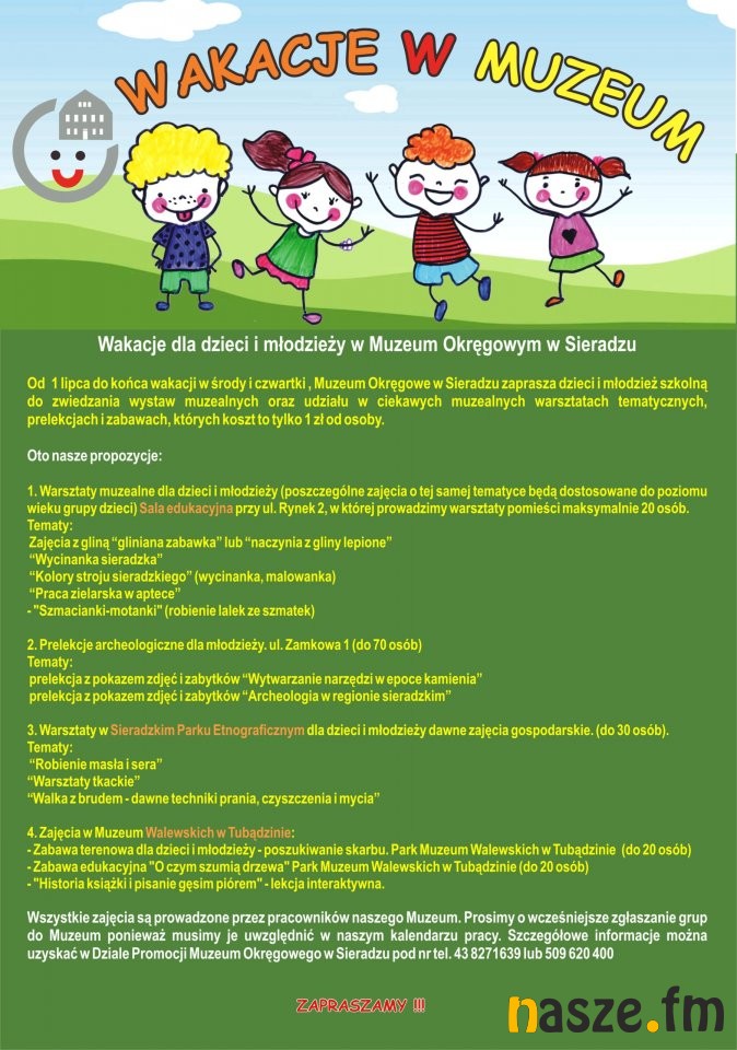 Od 1 lipca do końca wakacji w środy i czwartki Muzeum Okręgowe w Sieradzu zaprasza dzieci i młodzież szkolną do zwiedzania wystaw muzealnych oraz udziału w ciekawych muzealnych warsztatach tematycznych, prelekcjach i zabawach, których koszt to tylko 1 zł od osoby.