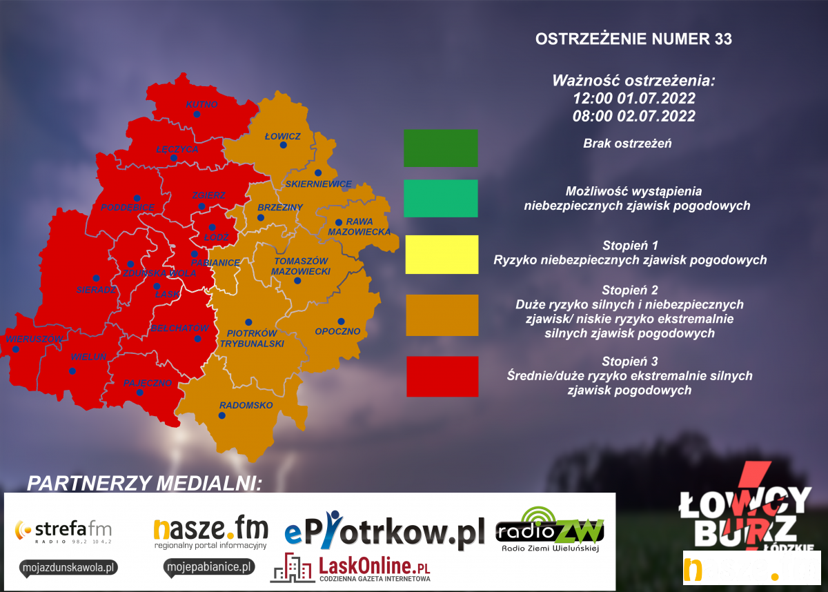 Czas obowiązywania: 20.00 dn. 01.07.2022 - 8.00 dn. 02.07.2022 na obszarze całego województwa.
