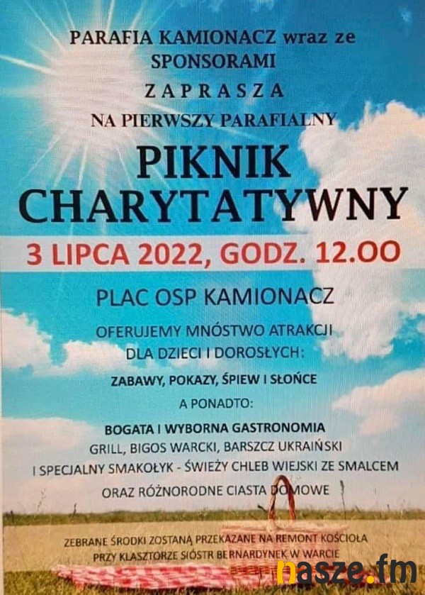 Parafia Kamionacz zaprasza już jutro na piknik charytatywny. Początek o godzinie 12. w Programie atrakcje dla dorosłych i dla dzieci. Nie zabraknie strefy gastronomicznej, tańca i śpiewu. Będzie też występ Overdrive Fun Studio z Pauliną Owczarek i Klaudią Dróżdż.