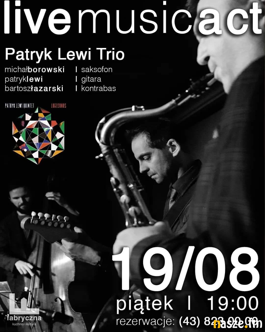Patryk Lewi Trio to zespół wywodzący się z warszawskiej sceny jazzowej. Instrumentalne trio zaprezentuje autorski materiał z najnowszej płyty LOGOSONUS. Debiutancki materiał autorstwa lidera jest efektem inspiracji zarówno muzyką improwizowaną z nurtu mainstreamowego, jak i dziełami spod znaku klasyki i awangardy.