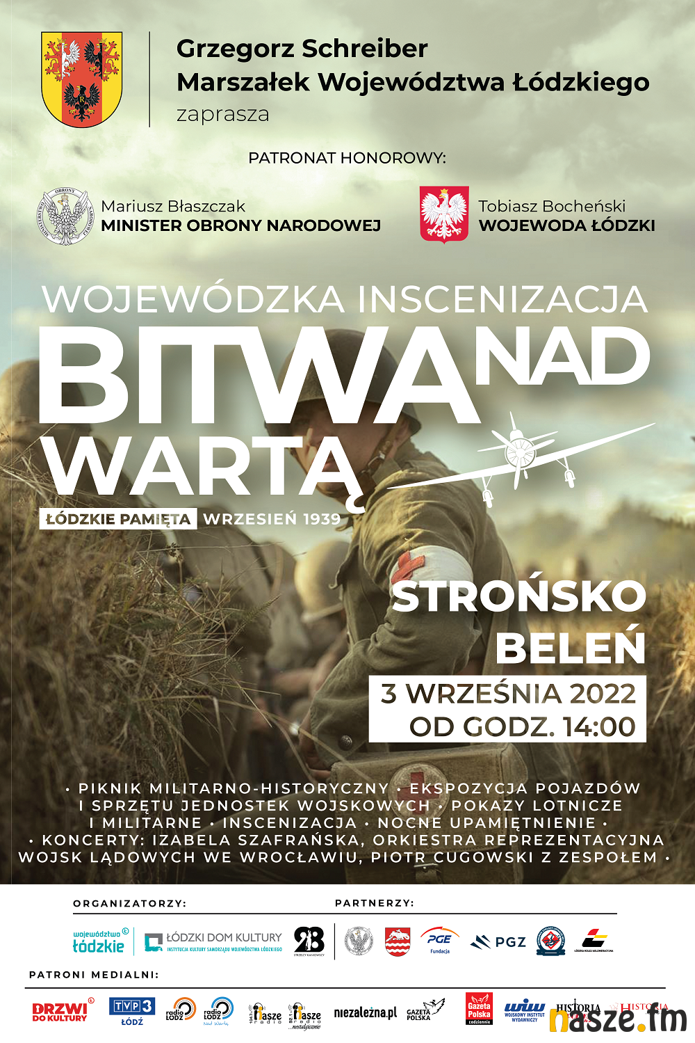 Patronat honorowy nad projektem "Łódzkie Pamięta - Wojewódzka Inscenizacja Bitwy nad Wartą wrzesień 1939 r." objęli Minister Obrony Narodowej Mariusz Błaszczak oraz Wojewoda Łódzki Tobiasz Bocheński.