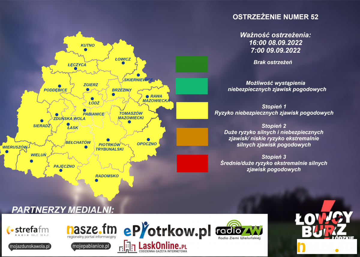 Instytut Meteorologii i Gospodarki Wodnej wydał ostrzeżenie pierwszego stopnia dotyczące silnego deszczu z burzami dla całego województwa łódzkiego. Załamanie pogody ma nastąpić dziś wieczorem lub w nocy. Ostrzegają też Łowcy Burz Łódzkie, według ich prognoz opadów możemy spodziewać się już po południu.