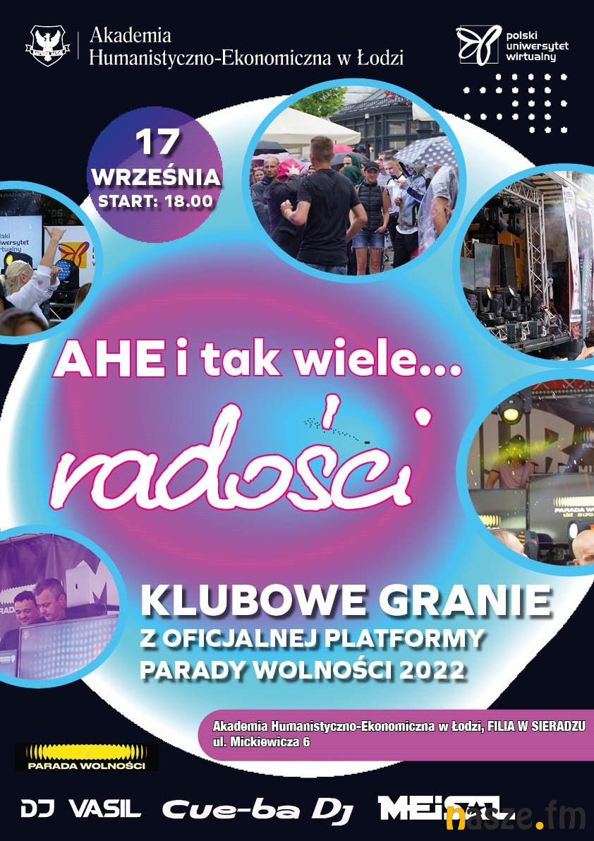 Od godz. 18.00 parking przy AHE (ul. Mickiewicza 6) zamieni się w parkiet taneczny. Z oficjalnej platformy muzycznej z Parady Wolności zagrają DJ Vasil, Dj Cue-ba, dj MEiSAL.Wstęp wolny.