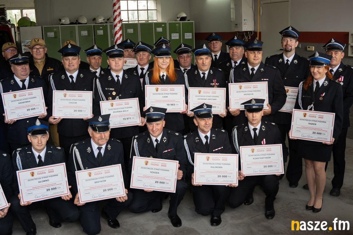 W siedzibie OSP Rąbień (pow. zgierski) symboliczne czeki odebrali druhowie z 27 jednostek z całego województwa - to tylko część ze wszystkich 156 OSP, które wygrały w konkursie "Zwiększenie potencjału ratowniczego ochotniczych straży pożarnych województwa łódzkiego". Po raz pierwszy jednostki mogły same aplikować o pieniądze, bez pośrednictwa gmin, jak to było do tej pory.