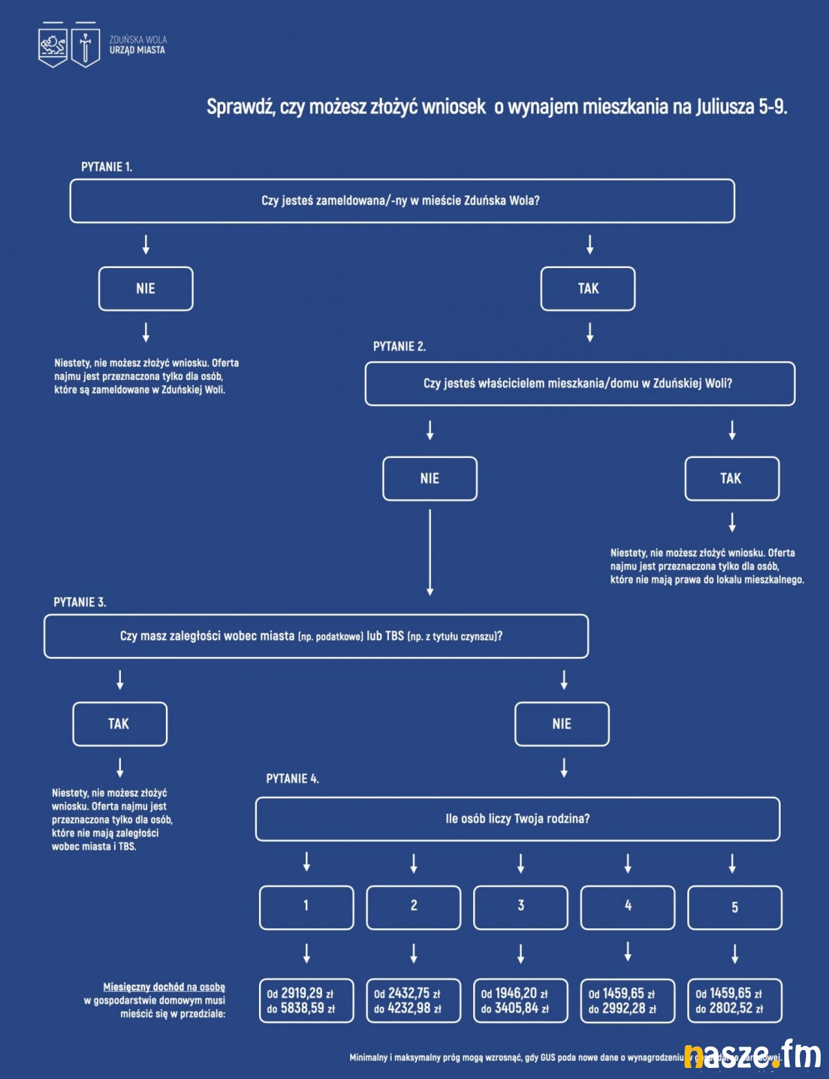 Podstawą wyliczenia, zgodnie z ustawą, były dane o wynagrodzeniu w gospodarce narodowej. I tak dwuosobowa rodzina będzie mogła wnioskować o mieszkanie przy ulicy Juliusza 5-9, jeśli jej dochód na osobę mieści się w przedziale od 2432,75 zł do 4232,98 zł miesięcznie na osobę. Trzyosobowa rodzina musi wykazać dochód od 1946,20 zł do 3405,84 zł, a czteroosobowa - od 1459,65 zł do 2992,28 zł miesięcznie na osobę.