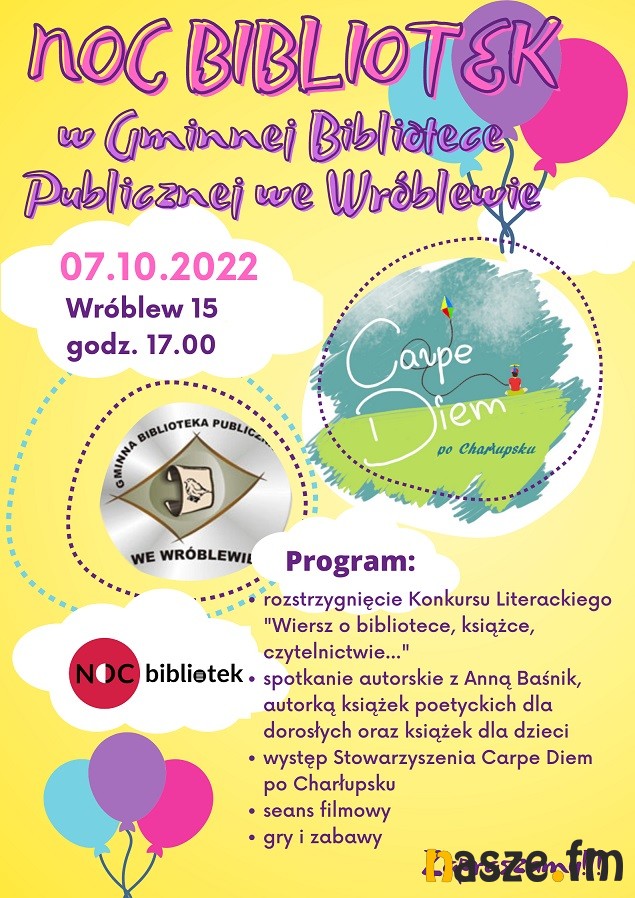 W akcję włącza się też Gminna Biblioteka Publiczna we Wróblewie, ale tu w związku z Nocą Bibliotek atrakcje na czytelników będą czekały dopiero w sobotę 7 października. Zaplanowano: rozstrzygnięcie Konkursu Literackiego "Wiersz o bibliotece, książce, czytelnictwie..." spotkanie autorskie z Anną Baśnik, autorką książek poetyckich dla dorosłych oraz książek dla dzieci występ Stowarzyszenia Carpe Diem po Charłupsku seans filmowy gry i zabawy. Początek o godz. 17:00.TUTAJ znajdziecie więcej informacji na ten temat.