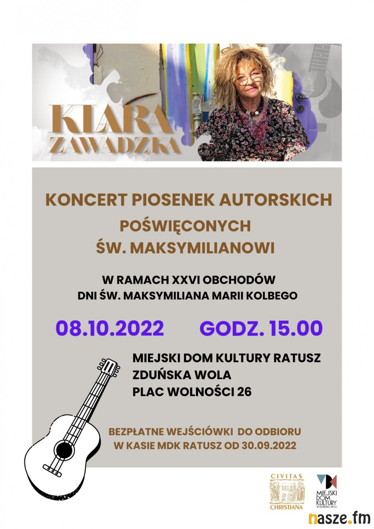 Klara Zawadzka – malarka, rzeźbiarka, poetka uświetni swoim koncertem XXVI Dni Św. Maksymiliana Marii Kolbego. Koncert odbędzie się w Miejskim Domu Kultury Ratusz w Zduńskiej Woli.