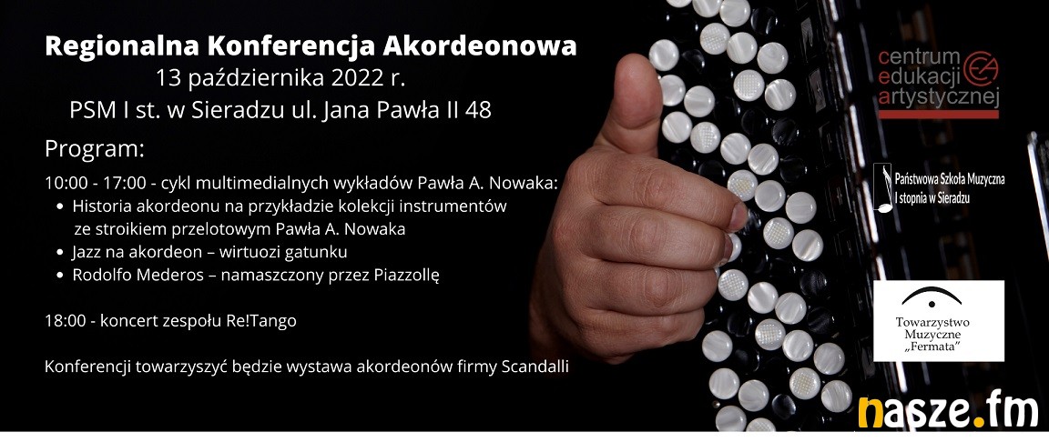 Ale to nie koniec atrakcji, z których będzie można skorzystać w tym dniu. O godzinie 10:00 rozpocznie się Regionalna Konferencja Akordeonowa pod patronatem wizytatora Centrum Edukacji Artystycznej Regionu Łódzkiego, Marcina Walickiego skierowana głównie do nauczycieli i uczniów szkół muzycznych Regionu Łódzkiego. Tematem przewodnim konferencji będzie historia akordeonu na przykładzie kolekcji instrumentów ze stroikiem przelotowym Pawła A. Nowaka, wirtuozi akordeonu oraz następcy Piazzolli. Konferencji towarzyszyć będzie wystawa akordeonów firmy Scandalli. Szczegółowy plan konferencji znajdziecie na plakacie poniżej.