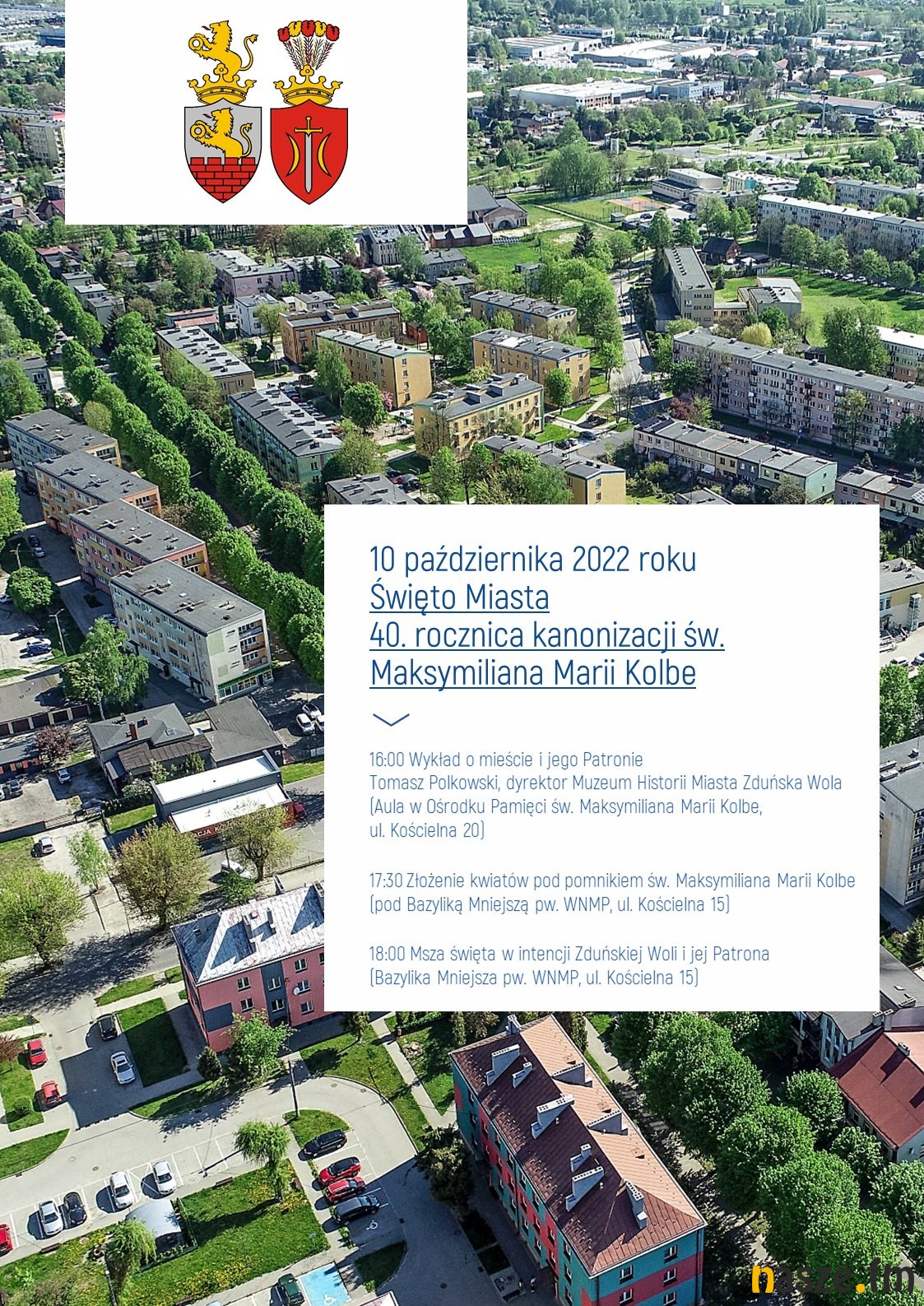 Z tej okazji będzie można posłuchać wykładu o mieście i jego patronie, który wygłosi Tomasz Polkowski, dyrektor Muzeum Historii Miasta Zduńska Wola. Początek godz, 16:00 w Ośrodku Pamięci św. Maksymiliana przy ul. Kościelnej 20.