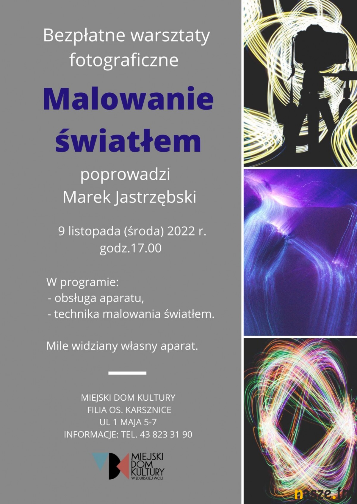 - "Malowanie światłem" to jeden ze sposobów robienia zdjęć, w którym na kadr, fotografowany z długim czasem ekspozycji, nanosimy dodatkowe elementy (np. linie, smugi), wykonane za pomocą dodatkowego, sztucznego źródła światła (np. latarki). Malowanie światłem to również świetna zabawa, dzięki której stworzycie mnóstwo zachwycających zdjęć - zapewniają animatorki z filii MDK.