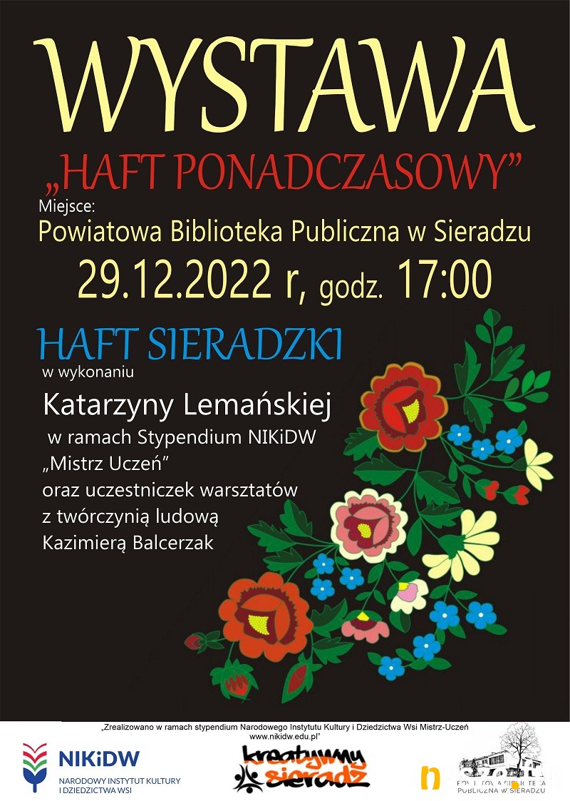 - Przez ostatnie pół roku mieliśmy okazję towarzyszyć dwóm sieradzankom: Kazimierze Balcerzak i Katarzynie Lemańskiej w realizacji projektu „Haft ponadczasowy" w ramach programu stypendialnego Narodowego Instytutu Kultury i Dziedzictwa Wsi „Mistrz-Uczeń", którego celem jest ratowanie lokalnego dziedzictwa i tradycji oraz zapewnienie ciągłości autentycznej twórczości ludowej. Podczas indywidualnych spotkań pani Kazimiera przekazywała wiedzę i umiejętności dotyczące haftu sieradzkiego swojej uczennicy- Katarzynie Lemańskiej, a oprócz tego dwa razy w miesiącu prowadziła warsztaty dla chętnych w naszej bibliotece. Nareszcie możemy podzielić się z Wami efektami tej intensywnej, półrocznej pracy- zapowiadają organizatorzy