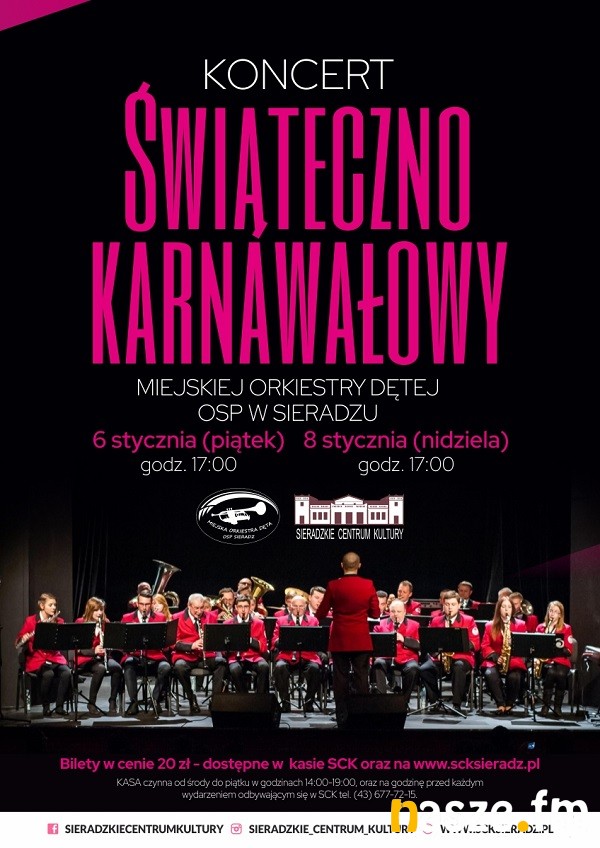 - Miejska Orkiestra Dęta OSP w Sieradzu zaprasza wszystkich miłośników muzyki na koncerty świąteczno- karnawałowe. Członkowie zespołu wraz kapelmistrzem Damianem Michalukiem zaprezentują efekt swojej kilkumiesięcznej pracy. Pierwszą część koncertu wypełnią najpiękniejsze polskie kolędy oraz piosenki o charakterze świątecznym. W drugiej części koncertu usłyszą Państwo utwory w różnych stylach muzycznych od klasycznego poprzez muzykę filmową do standardów polskiej i amerykańskiej muzyki rozrywkowej. Miło nam będzie gdy spędzą Państwo z nami ten wyjątkowy wieczór. Myślę, że z pewnością zaspokoimy gusta szerokiej publiczności- przekazują muzycy oraz organizatorzy