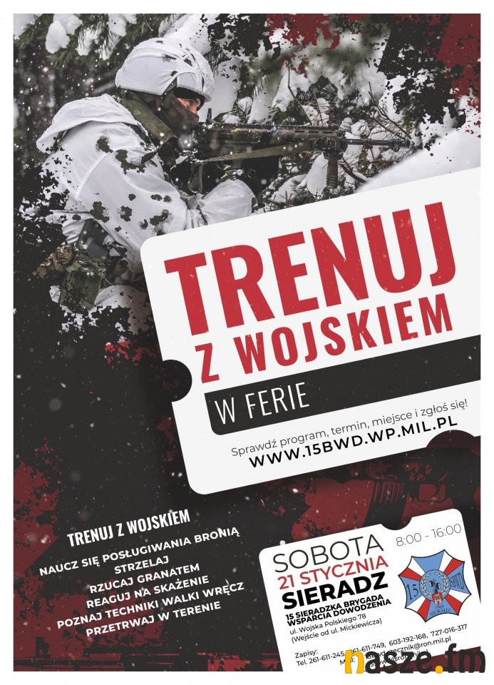 Od połowy stycznia, do końca lutego w 31 jednostkach wojskowych na terenie całego kraju i w każdym województwie będzie można wziąć udział w popularnych - sobotnich szkoleniach wojskowych dla każdego. Armia zapewnia profesjonalne umiejętności, przygotowanie wojskowe, wojskowy poczęstunek oraz dobrze i miło spędzony czas. To miejsce dla każdego!