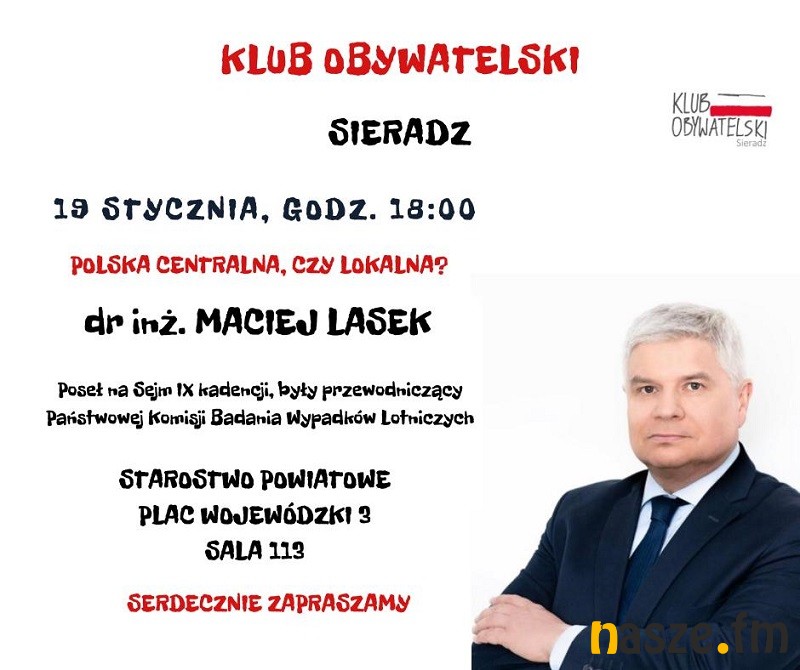 W Sieradzu będzie jutro spotkanie w ramach Klubu Obywatelskiego z dr inż. Maciejem Laskiem. Organizatorzy zapraszają do sali 113 starostwa o godzinie 18.